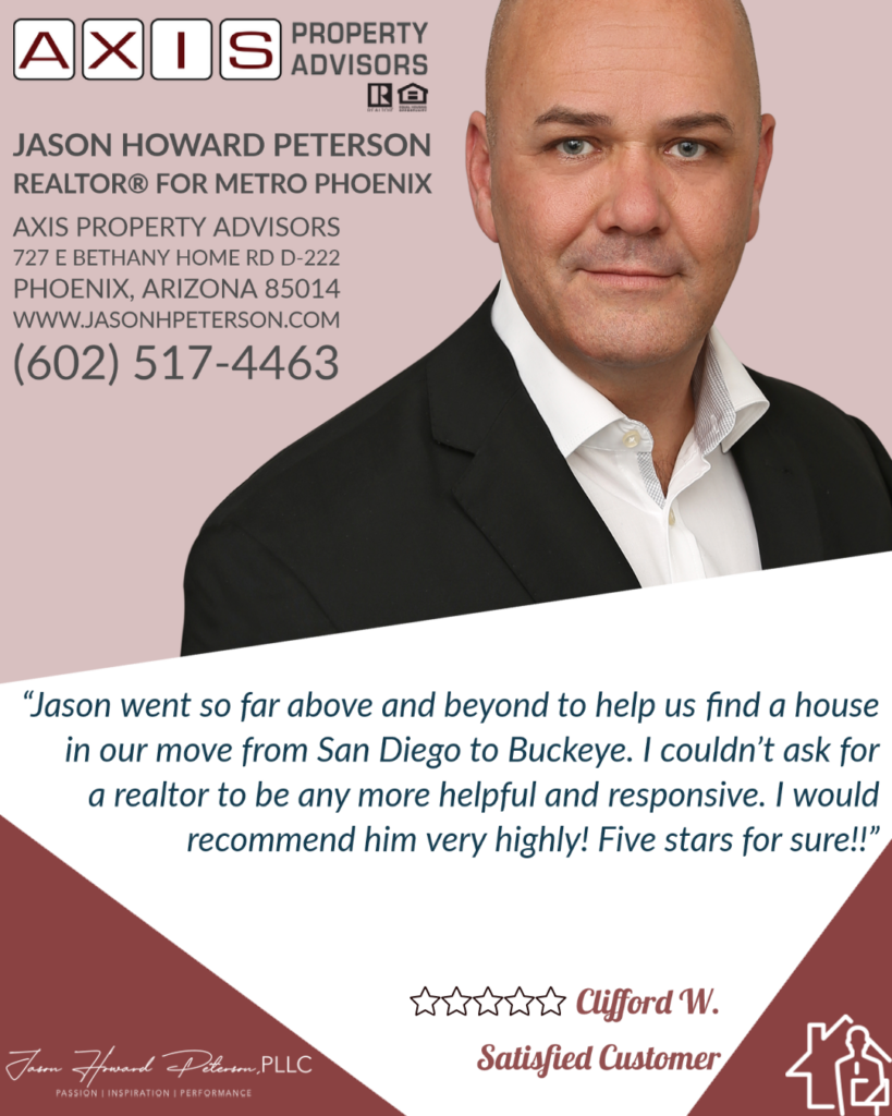 Satisfied Customer: Clifford W. Endorsements/Reviews Feb 6 Written By Jason went so far above and beyond to help us find a house in our move from San Diego to Buckeye. I couldn’t ask for a realtor to be any more helpful and responsive. I would recommend him very highly! Five stars for sure!!Clifford W.