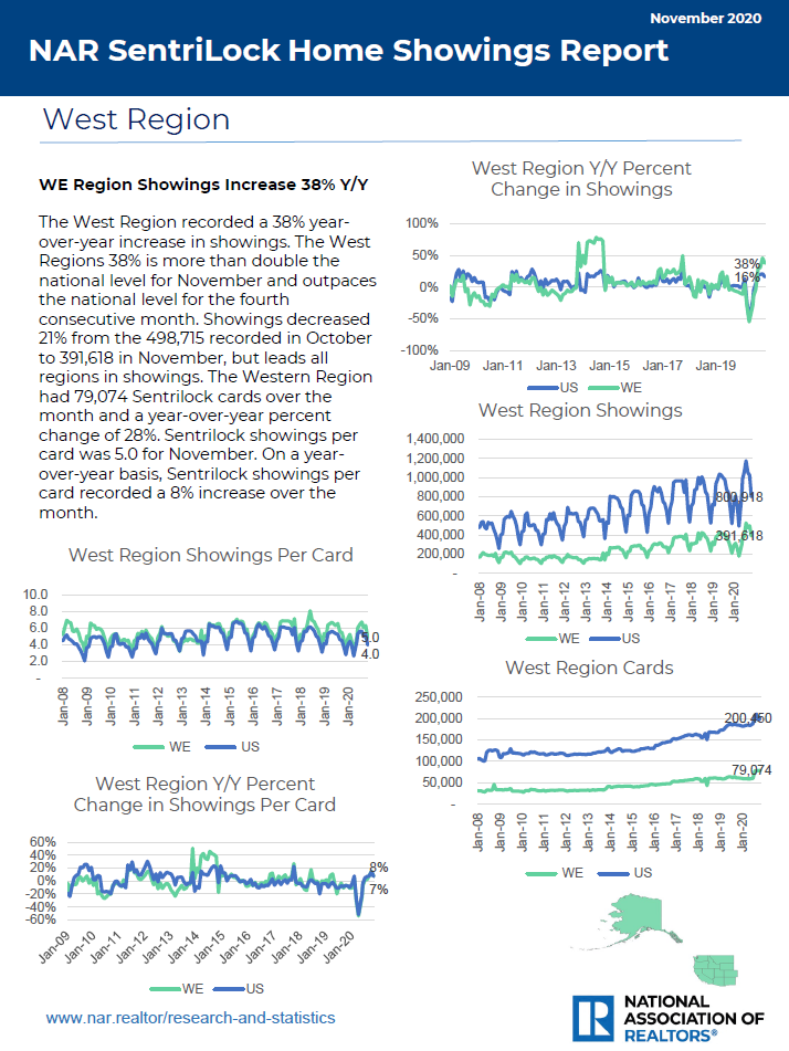 Home showings on homes with Sentrilock lockboxes increased in November compared to one year ago. Nationally, Sentrilock home showings were up 16% year-over-year. Showings rose in the West and Northeast regions, but declined in the Midwest and South regions. As a measure of the diffusion of the change in showings across about 200 MLS boards, the Sentrilock Showings Diffusion Index declined to 29.4.